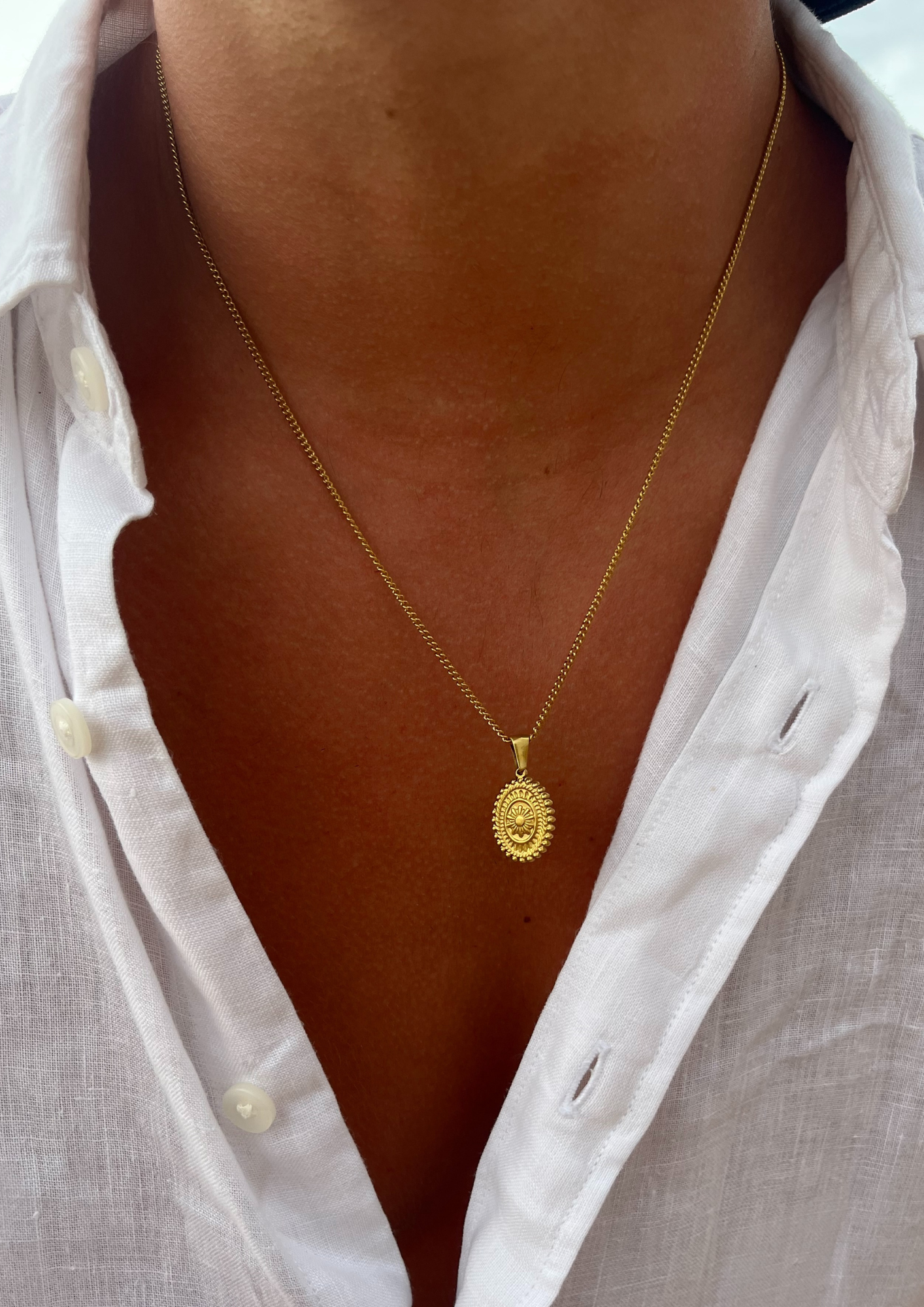 Soleil is more than sunshine, it's a lifestyle. A radiant sun fused with a delicate cross, this necklace captures the golden heart of summer and the quiet glow of inner peace. Wear it from sunrise to sunset.